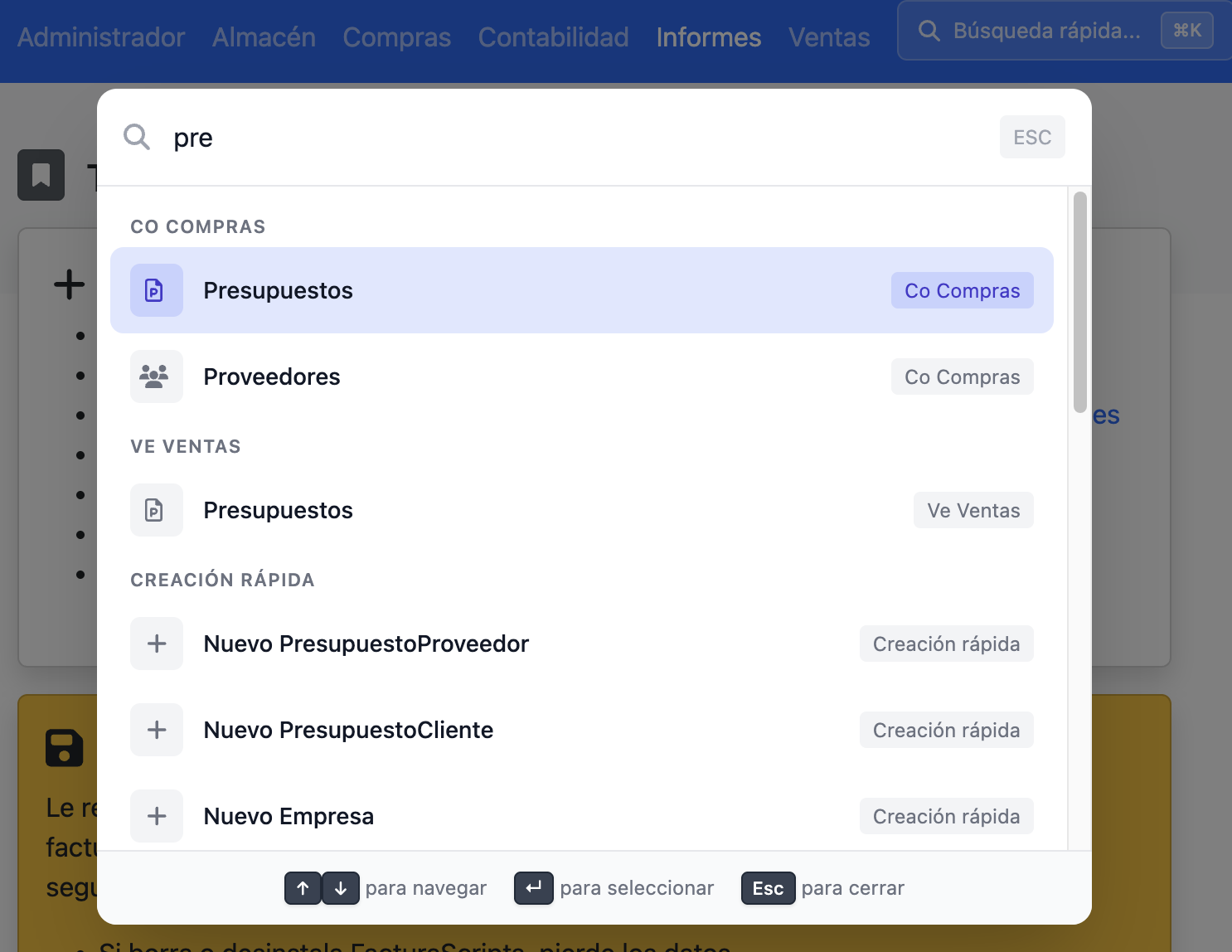 abrir un buscador rápido que te permite navegar instantáneamente a cualquier sección del menú, crear nuevos registros y acceder a la configuración sin usar el ratón.