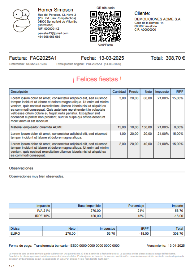 - Compatible con Verifactu (a partir de la versión 2.0 de FacturaPDF1 y con el plugin Verifactu instalado y activado). Muestra el QR en la factura acorde con las especificaciones de la Agencia Tributaria española.