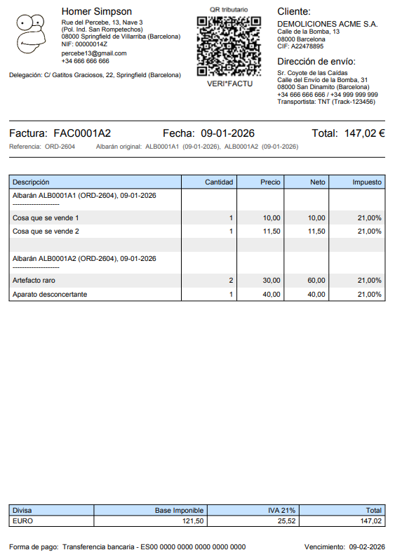 Activando el plugin FacturaPDF1, todas las facturas, presupuestos, albaranes y pedidos se imprimirán a partir de ahora en este nuevo formato.