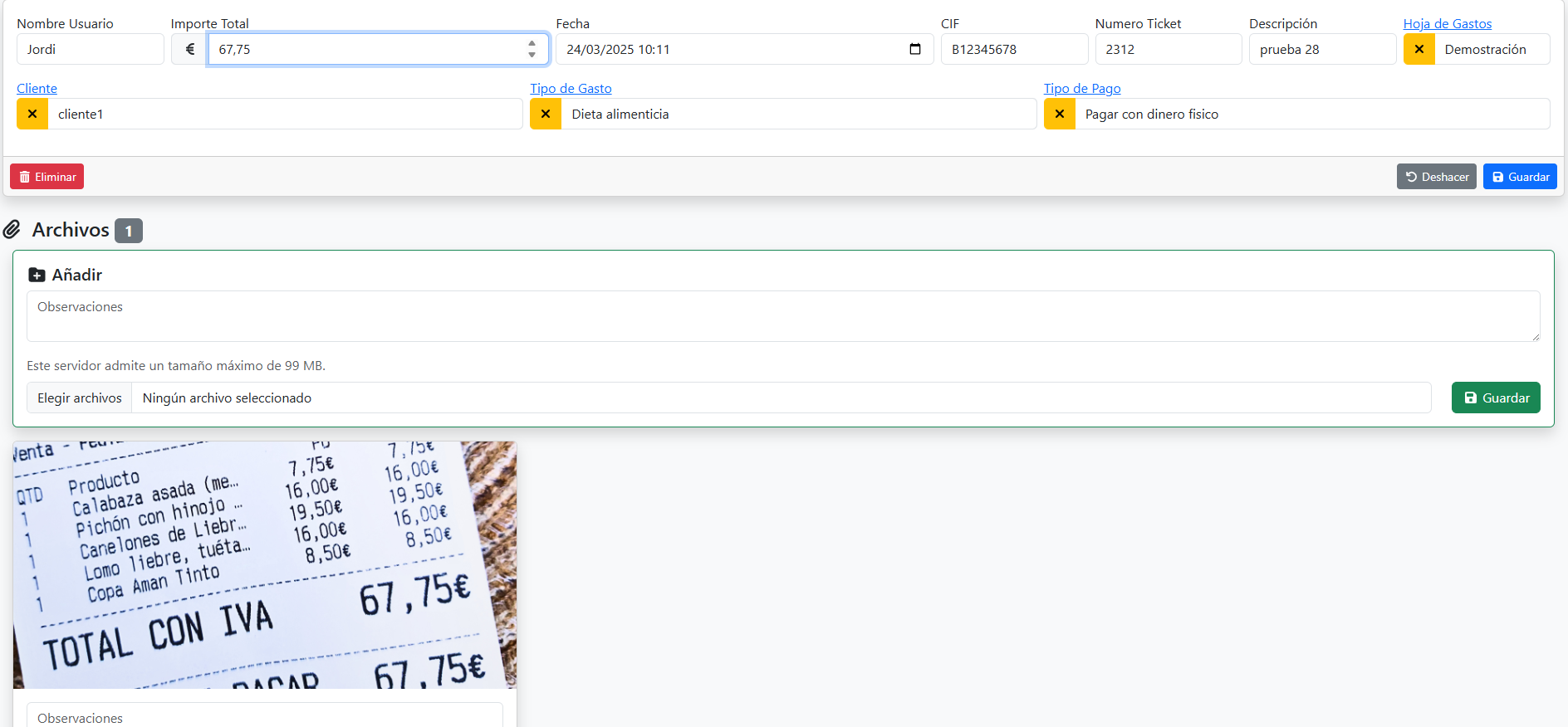 Diseñado para crear hojas de gastos, mensuales o por periodos, y que los usuarios vayan añadiendo los gastos generados, subiendo el ticket y con los datos mínimos, asociado a la hoja de gastos. Con el objetivo de validar la hoja de gastos entera y permitir generar el asiento de todos los gastos a la vez.