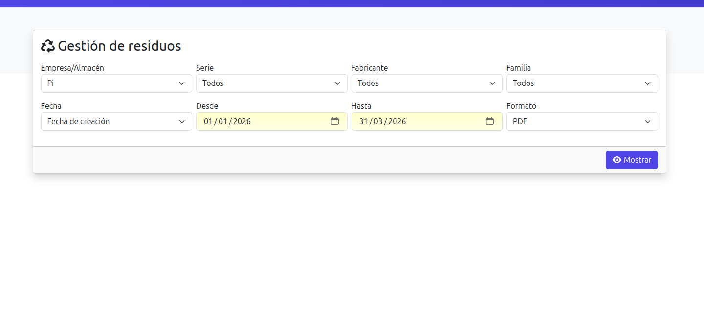 Genera un informe (PDF o CSV) a partir de las facturas de venta, filtrando únicamente los productos marcados como RAEE en su ficha (`productos.raee = 1`). Para cada línea calcula el peso total (`peso_gr * cantidad / 1000`) y muestra los totales en unidades y kilogramos.