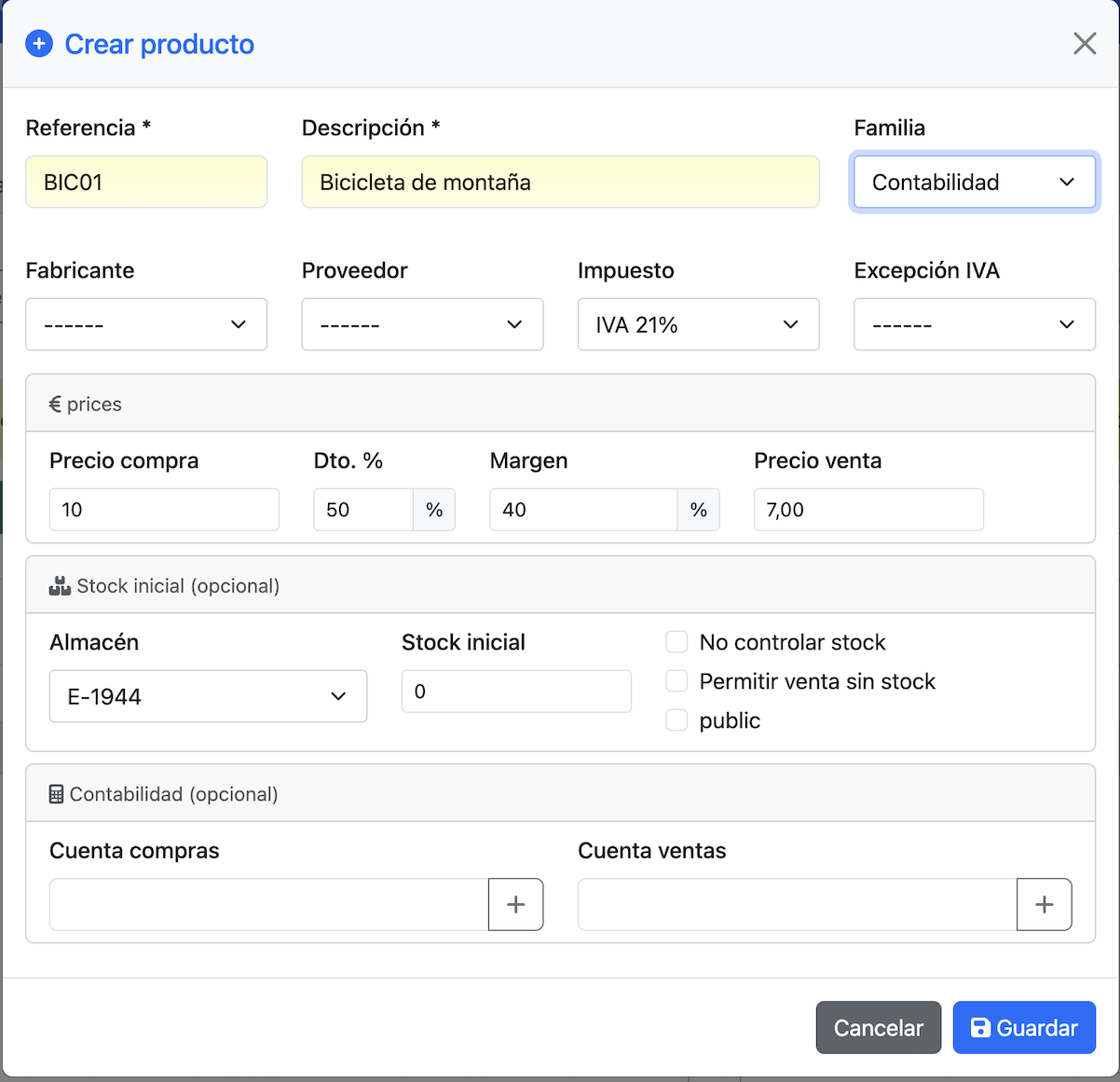 Cuando escribes un producto que no existe en presupuestos, pedidos, albaranes o facturas, aparece la opción "+ Crear producto" en el desplegable. Al seleccionarla se abre un formulario donde puedes completar referencia, precio, descripción, familia, fabricante, impuesto y cuentas contables. El producto se crea y se asigna automáticamente a la línea del documento.