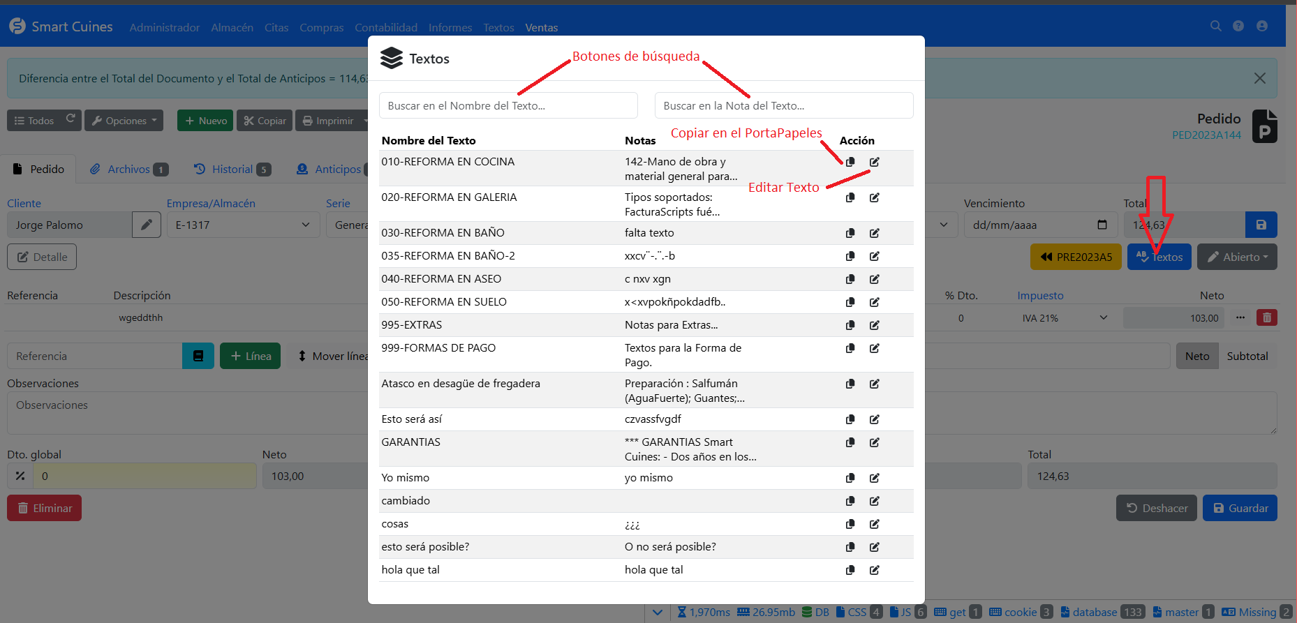 Descargar ContactoPlugin que permite administrar los textos que generemos para su uso cotidiano, organizados por Grupos de Textos. Con este plugin se consigue evitar tener en un fichero de texto de nuestro PC esos textos que necesitamos incluir en nuestros documentos de compra o de venta. Para eso, se mostrará en los documentos, un botón de acceso rápido a esos textos.