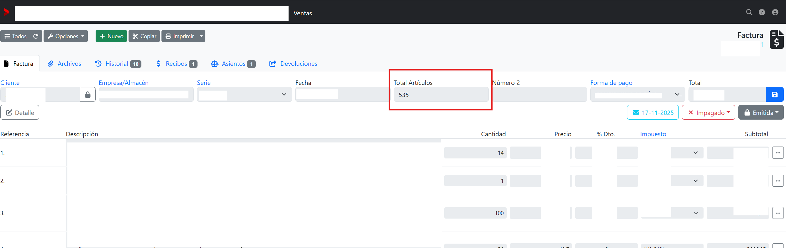 Imagina una factura con 45 líneas de productos diferentes. Cada línea tiene su propia cantidad: 10 cajas aquí, 25 unidades allá,