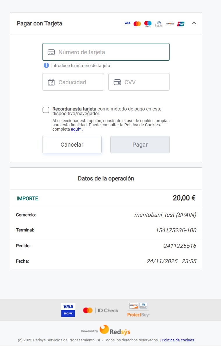🔒 Cumple con los estándares PSD2 y la seguridad de Redsys.