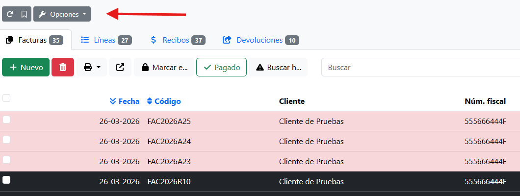 Cuando está activado para una vista (por ejemplo, el listado de facturas a clientes):
