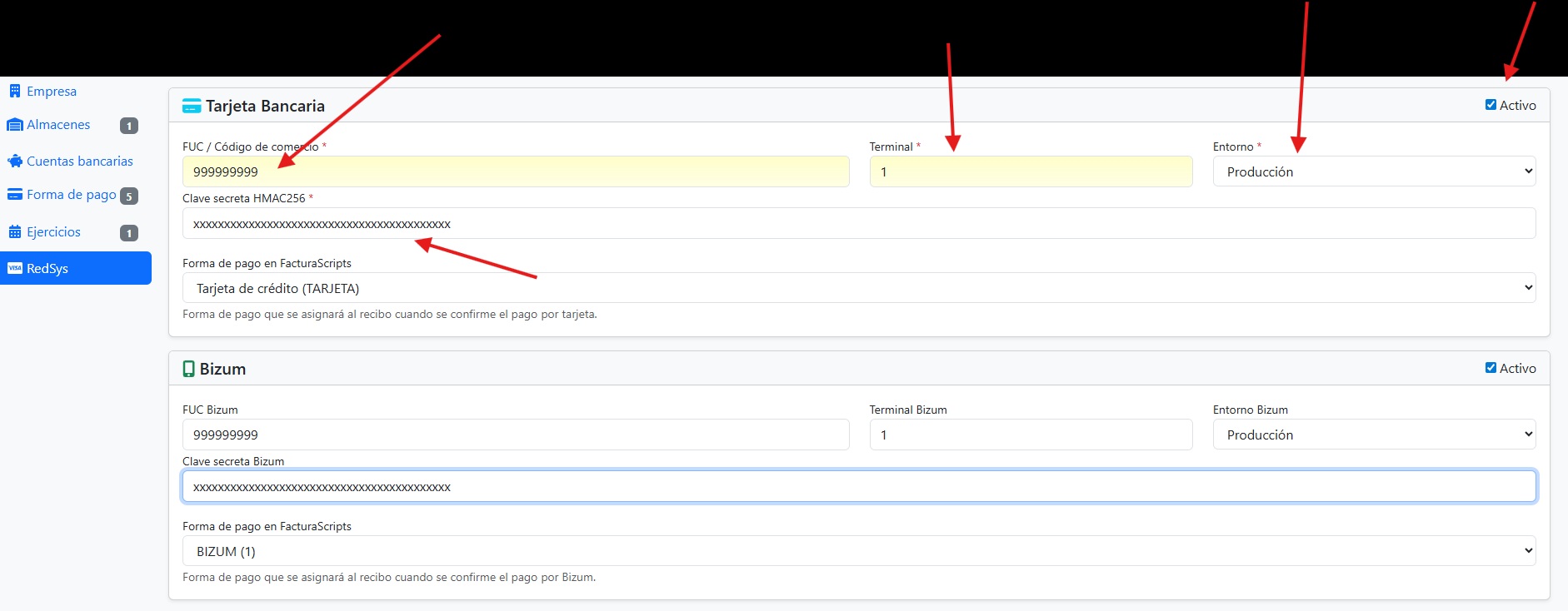 Nota: Si tienes varias empresas, cada una puede tener su propia configuración RedSys con diferentes terminales y claves.