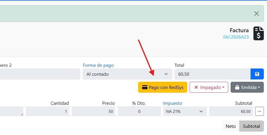 - En la cabecera verás el botón Pago con RedSys.