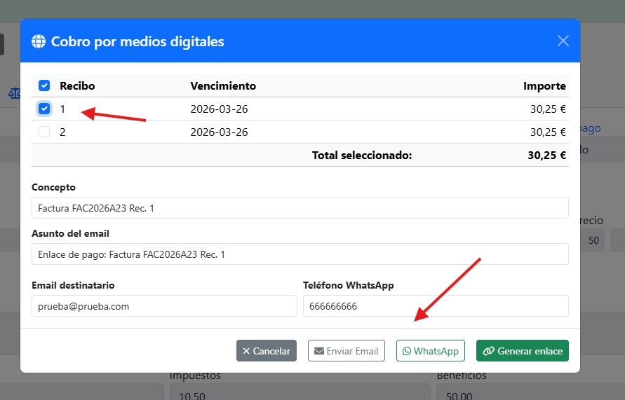 - Al pulsarlo se abre un modal con los recibos pendientes de la factura.