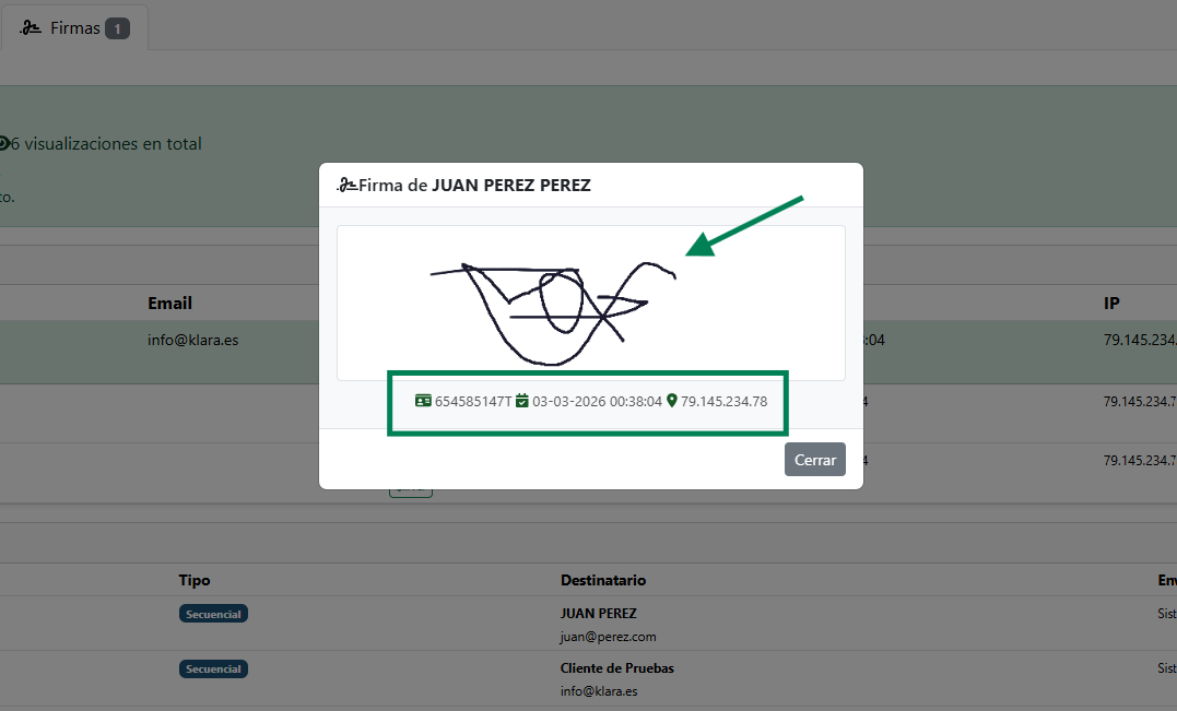 Pulsando Ver firma en el historial se abre una ventana emergente con todos los datos registrados en el momento de la firma. Esta información queda almacenada de forma permanente y puede consultarse en cualquier momento desde la ficha del documento.