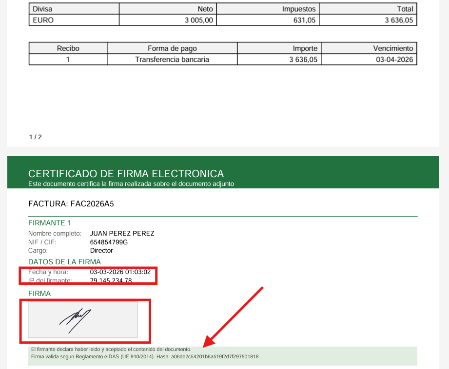 Al imprimir o descargar el PDF del documento firmado, el archivo incluye una página adicional con el certificado de firmas: imagen de la firma, datos del firmante, hash del documento y aviso legal de validez.