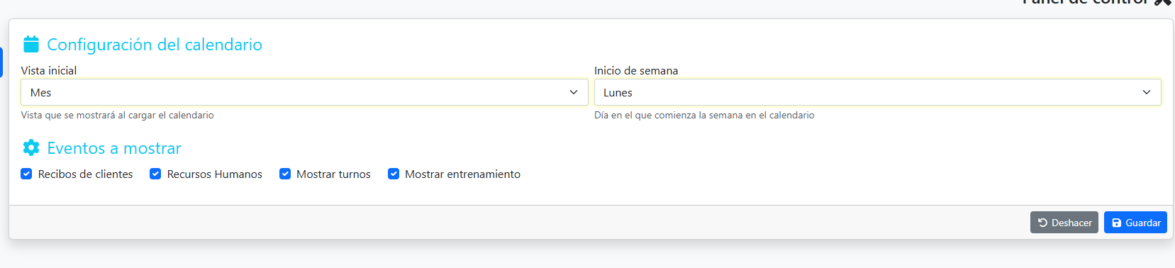Esta configuración permite personalizar el calendario según las necesidades de cada usuario o empresa, mostrando solo la información relevante y facilitando una planificación más clara y ordenada de turnos, vencimientos y eventos operativos.