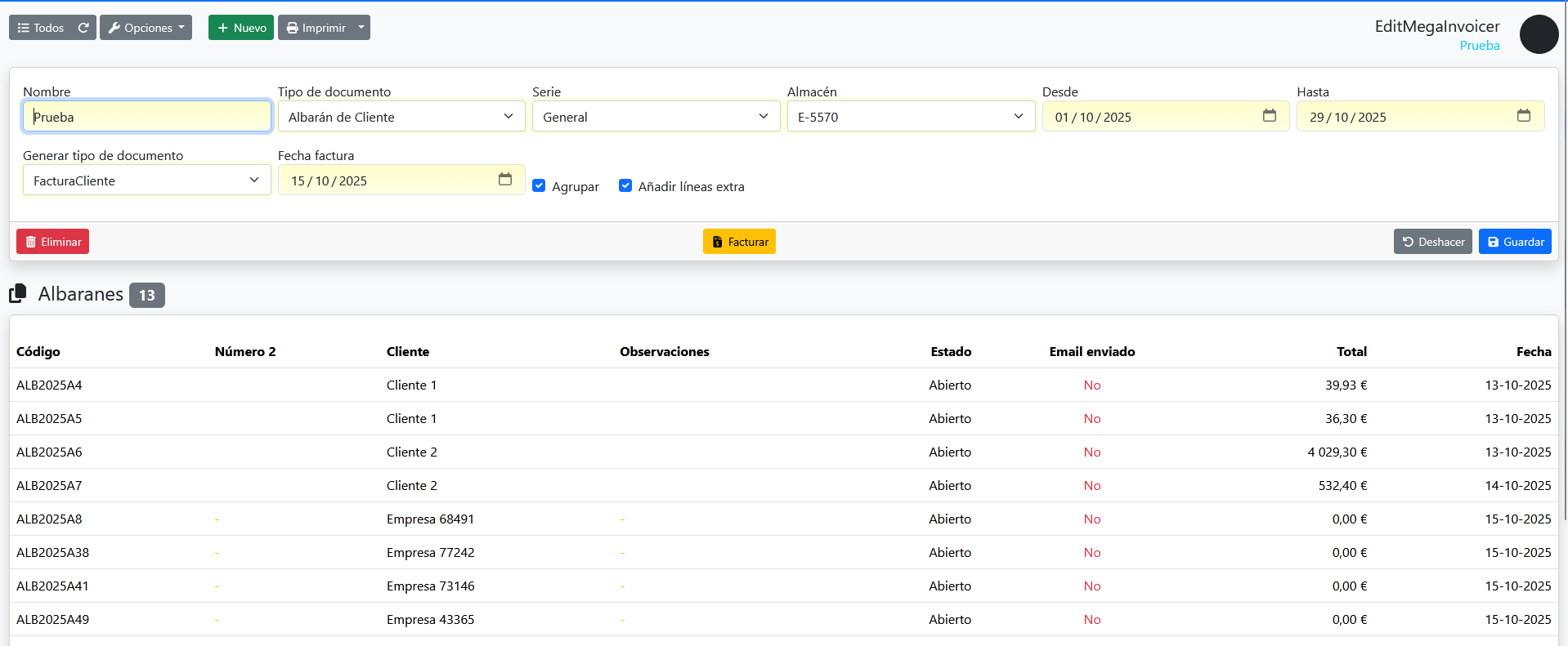 Permite facturar cada albarán individualmente o agruparlos por proveedor o cliente.
