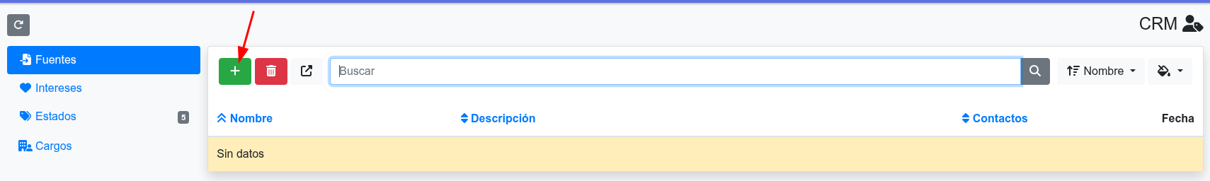 Para añadir o editar las fuentes debemos ir al menú Administrador → CRM, y en el lado izquierdo seleccionar fuentes. Aquí estará el listado de todas las fuentes creadas. Para añadir una nueva solo hay que darle al botón nuevo.