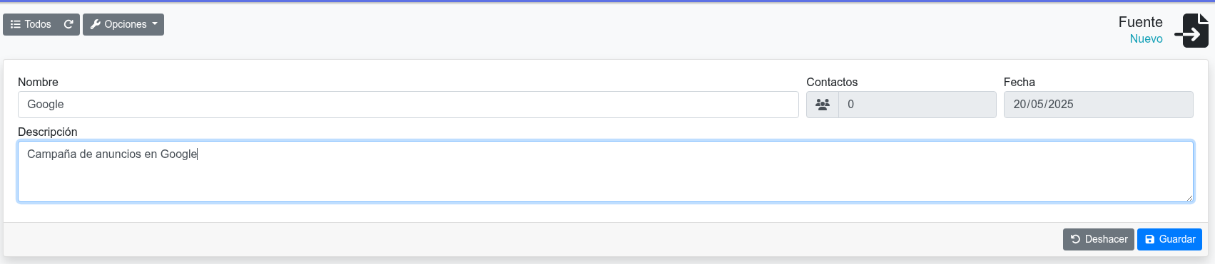 Las fuentes nos sirven para indicar desde qué sitio se captó el contacto. Por ejemplo, si hacemos una campaña de publicidad en Google, podemos crear la fuente con el mismo nombre de la campaña de publicidad, de tal forma que los contactos que se consigan desde dicha campaña de publicidad se asocian con esa fuente. ¿Para qué sirve esto?, pues el objetivo es saber qué fuentes funcionan mejor y cuál peor para tomar decisiones sobre las campañas de publicidad.