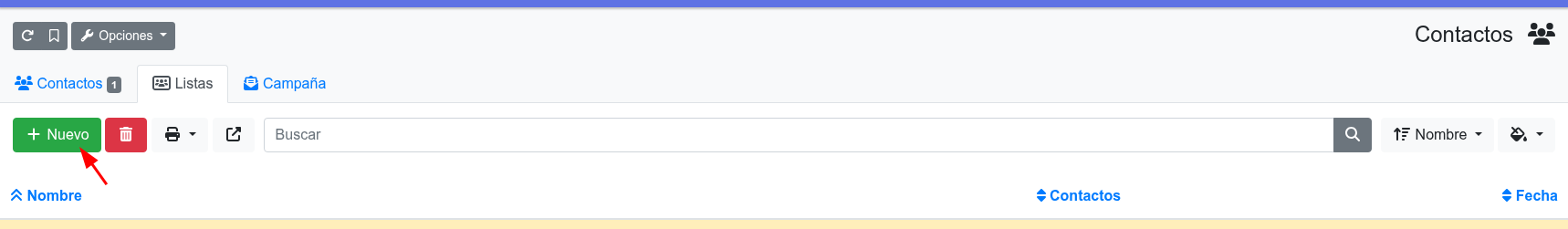 Puede crear listas de contactos desde el menú CRM → Contactos, en la pestaña Listas pulse el botón nuevo.