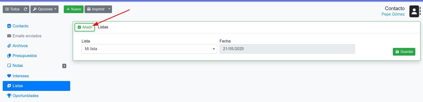 También puede asignar un contacto a una lista desde el propio contacto. En la sección listas, pulsé el botón añadir, seleccione la lista y pulse guardar.