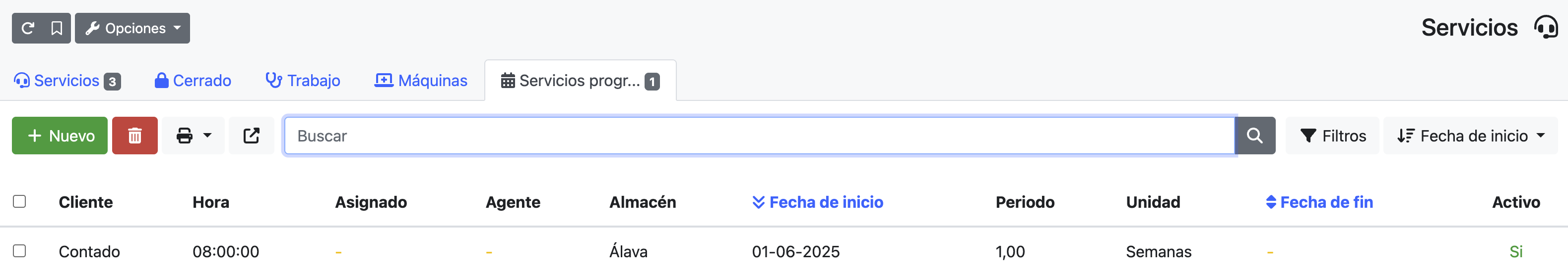 Desde el menú Ventas > Servicios, pestaña de Servicios programados, podrás ver todos los servicios programados que tengas configurados, además de poder buscar y filtrar entre ellos.