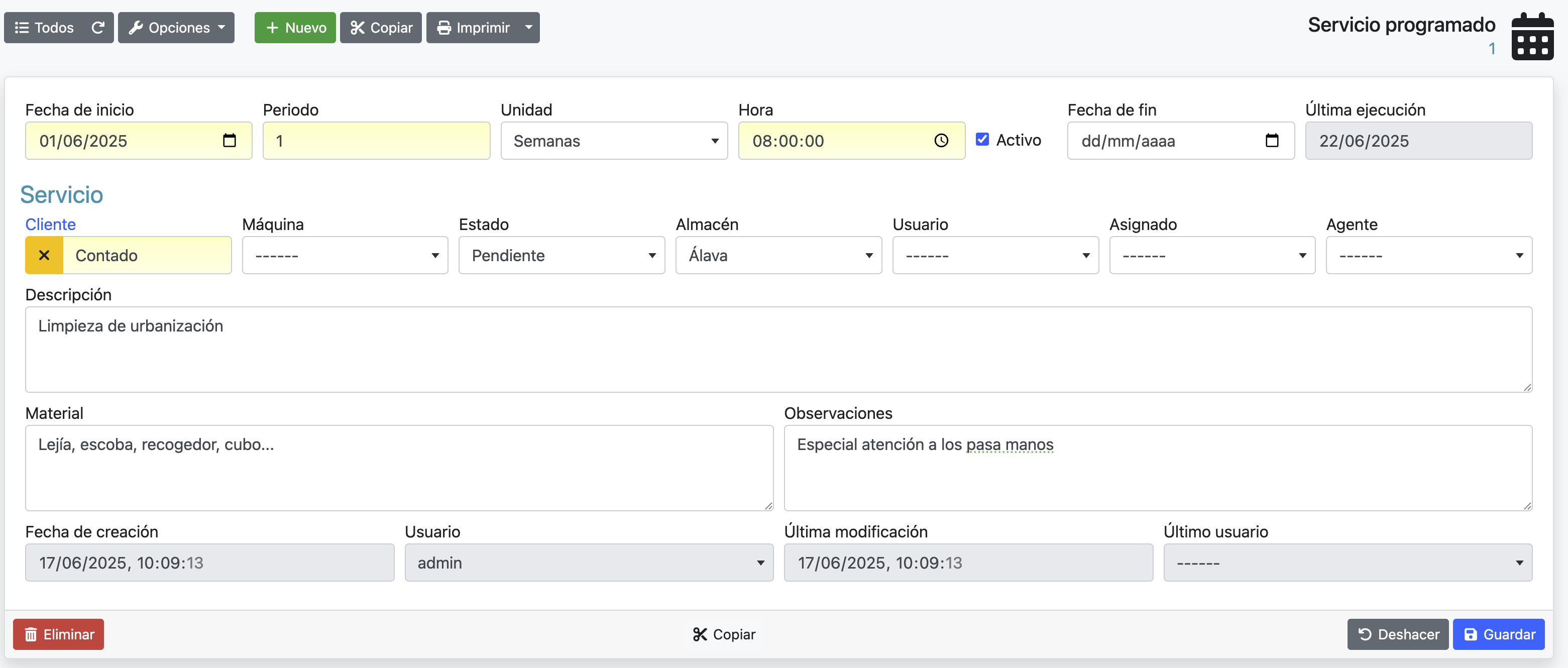Como los servicios pueden tener trabajos, desde el servicio programado puedes dejarlos configurados, de tal forma que al crear el servicio ya lo creé con sus trabajos correspondientes. Los datos a rellenar son los básicos para generar un trabajo en un servicio.