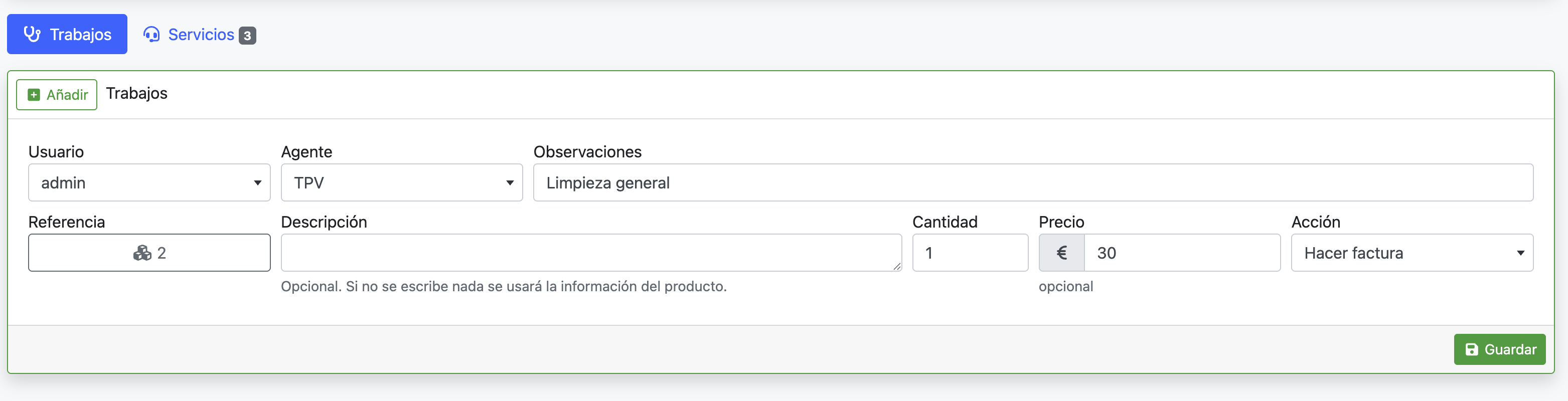 Una vez guardado el servicio podrás añadir los trabajos en la parte inferior.