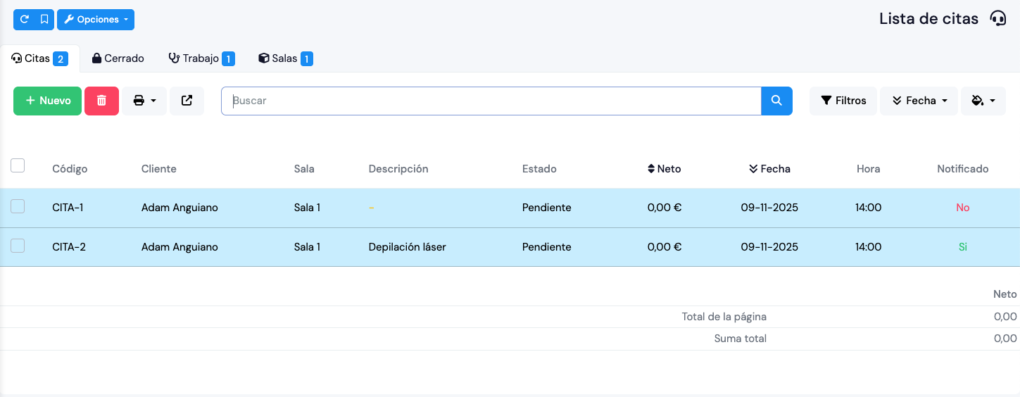 Clicamos en el menú Citas -> Lista de citas. Desde esa sección vamos a + Nuevo para crear una nueva cita.