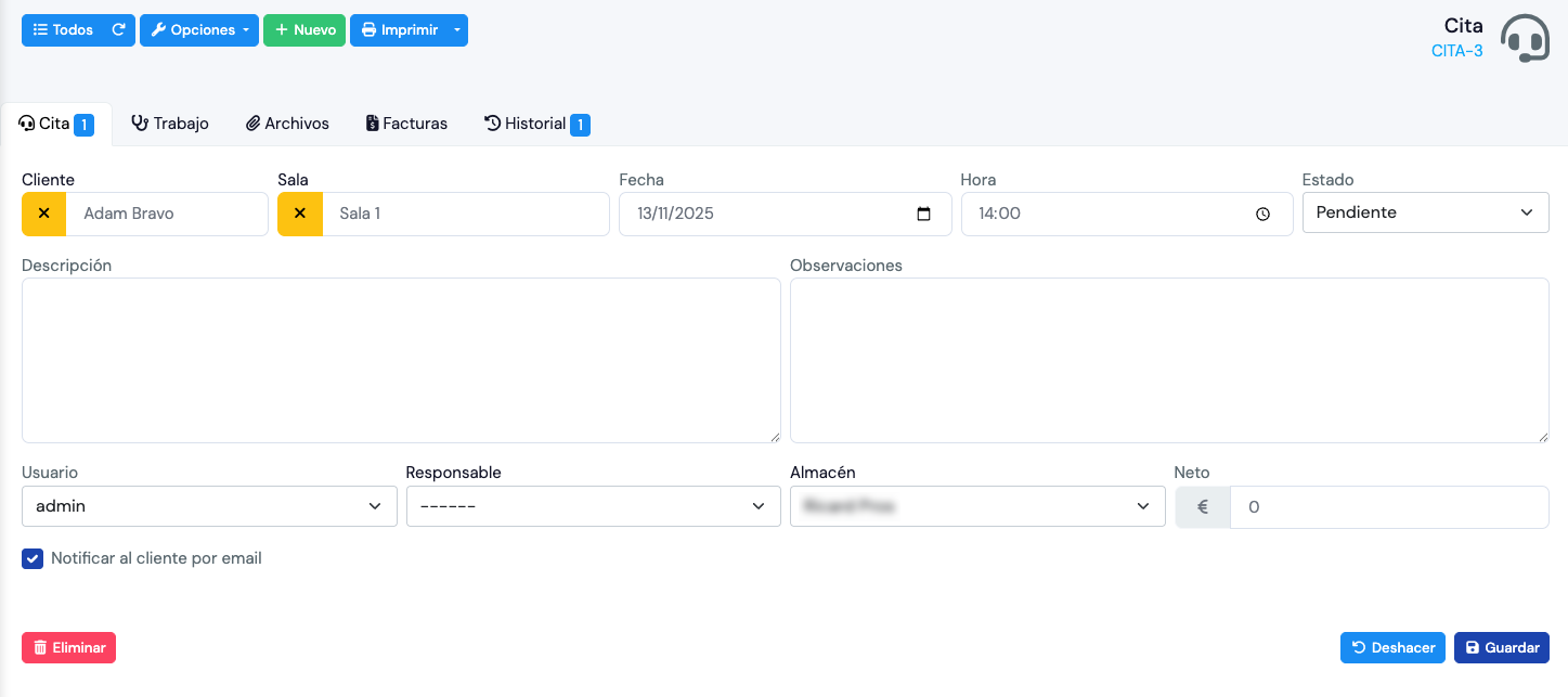 - Neto, este es un campo de solo lectura que guardará el monto total neto de los servicios o trabajos que se hayan efectuado en la cita