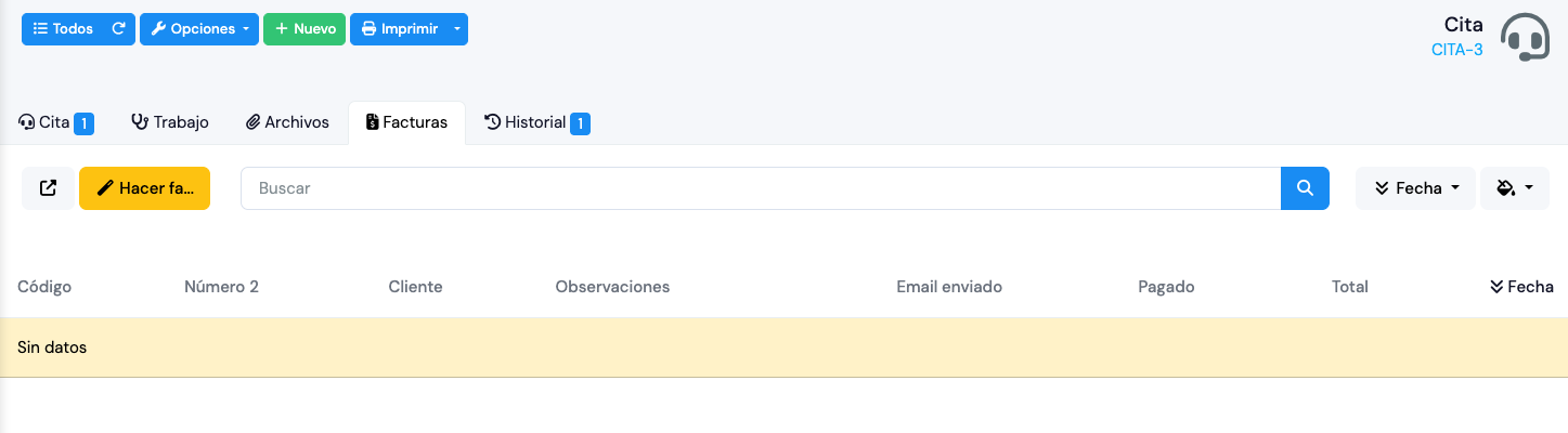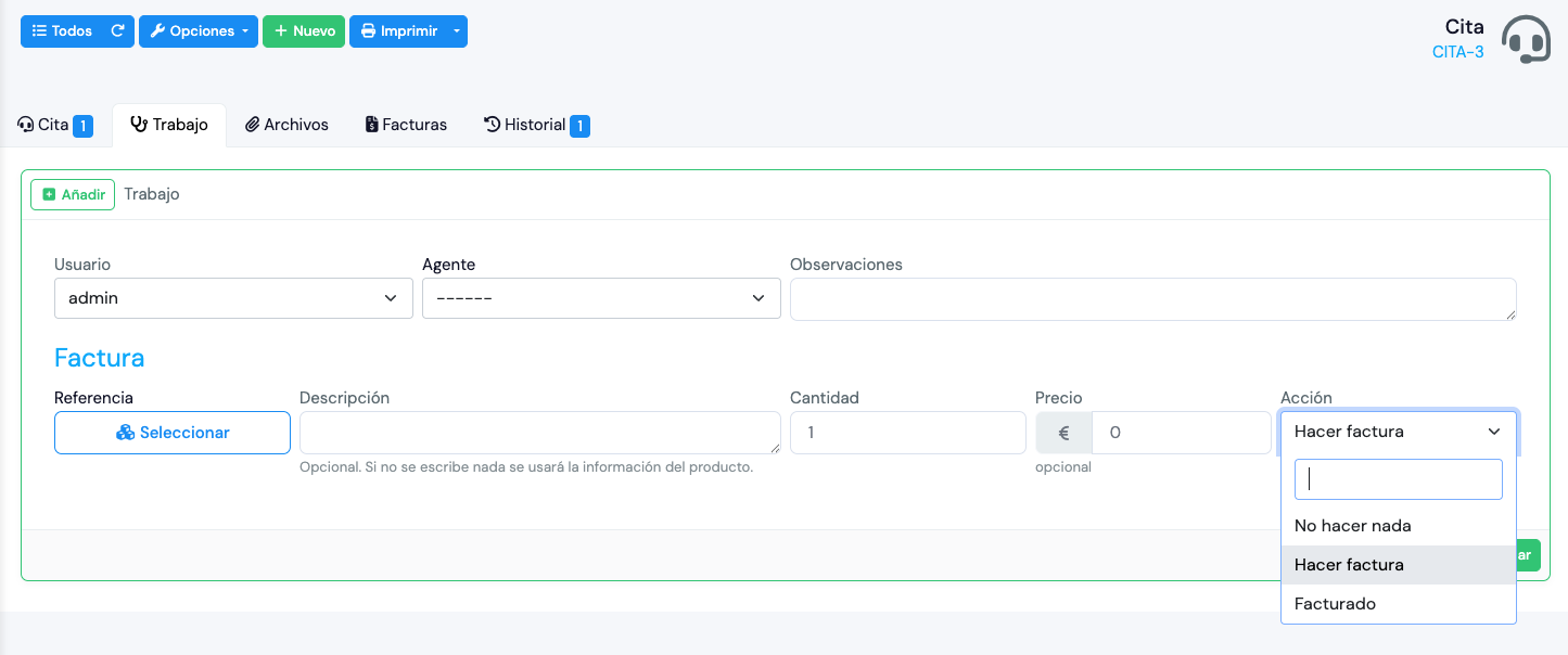 Por defecto, los trabajos se encuentran configurados con la acción 'Hacer factura' de manera que podamos hacer la factura de estos desde la pestaña 'Facturas'. Al crear la factura los trabajos cambiarán su acción a 'Facturado'.