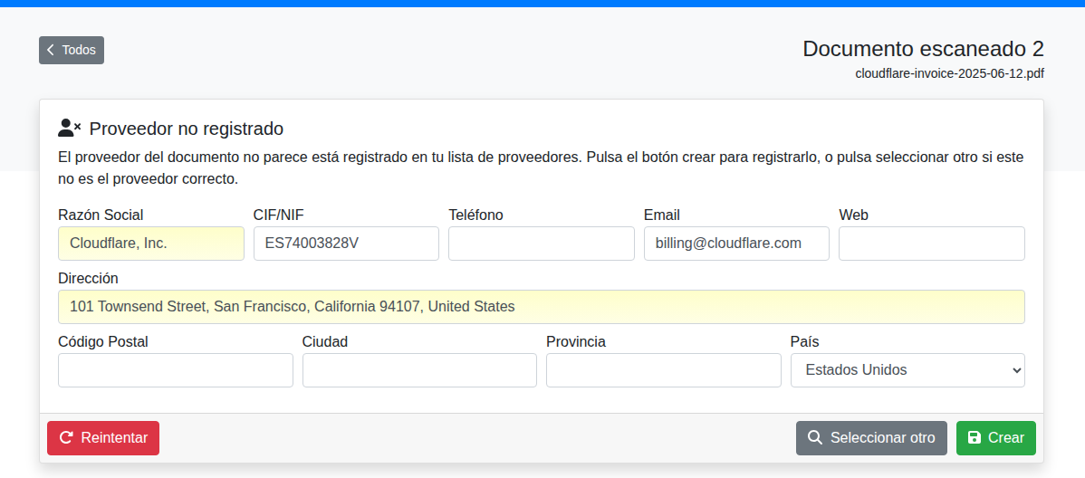 Una vez procesado el documento se seleccionará automáticamente el proveedor de dicha factura. Si es un proveedor que no se encuentra en la lista de proveedores (busca por cif/nif y por nombre), aparecerá la pantalla de nuevo proveedor, donde podemos ver la información detectada: nombre, dirección, email, etc. Pulsa el botón Crear para guardar este nuevo proveedor. Si el proveedor si que estaba en la lista pero la IA no lo ha detectado, puedes pulsar el botón seleccionar otro y elegir el proveedor correcto.