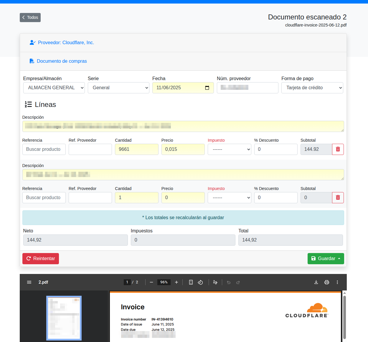 Una vez seleccionado el proveedor podremos ver la información completa de la factura: fecha, número, referencias, descripciones y precios.