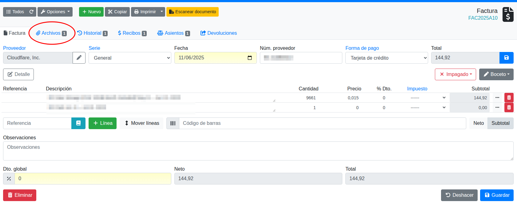 Además, el documento original se queda vinculado a la factura y lo puedes ver en todo momento en la pestaña archivos de la factura.