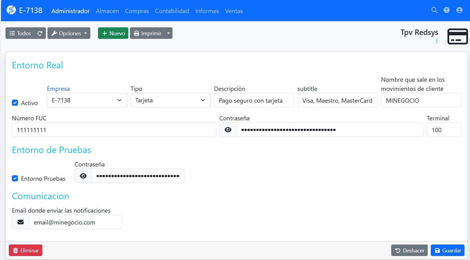 Entorno Pruebas: si está activado usará la clave de pruebas y las operaciones no serán reales, acuérdate de desactivarlo cuando pases a entorno de producción o no recibirás pagos y además las facturas se marcarán como pagadas.