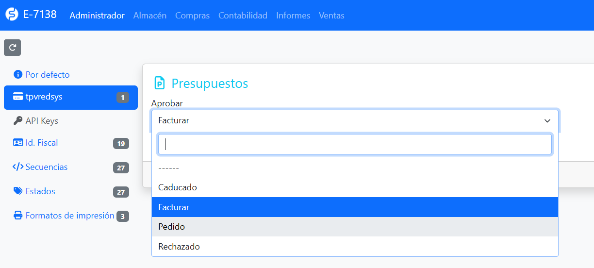 Si queremos que al pagar un presupuesto desde el tpv se convierta automáticamente, en pedido, factura debemos ir al menu Administrador > Panel de Control > Pestaña tpv Redsys y elegir del desplegable a qué tipo de documento queremos que se convierta el presupuesto.