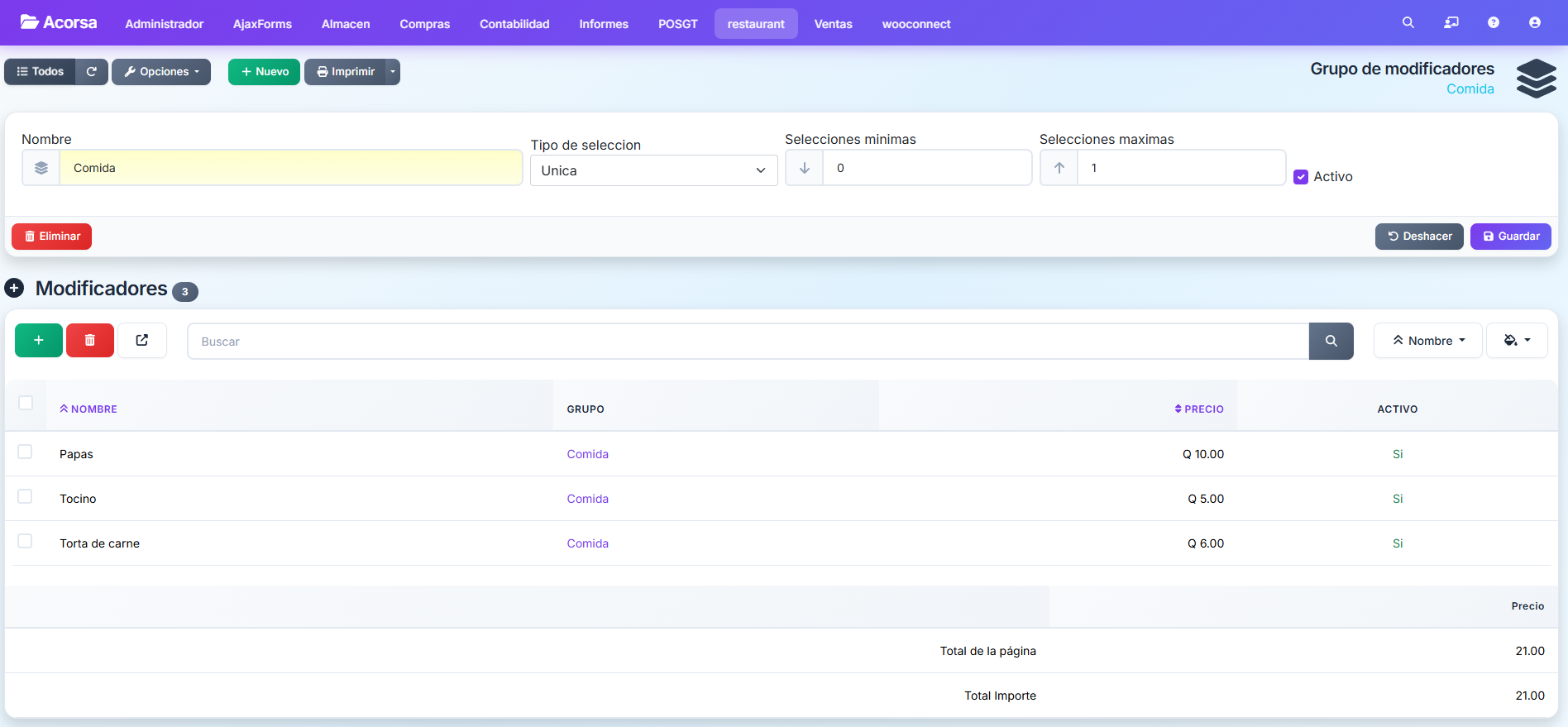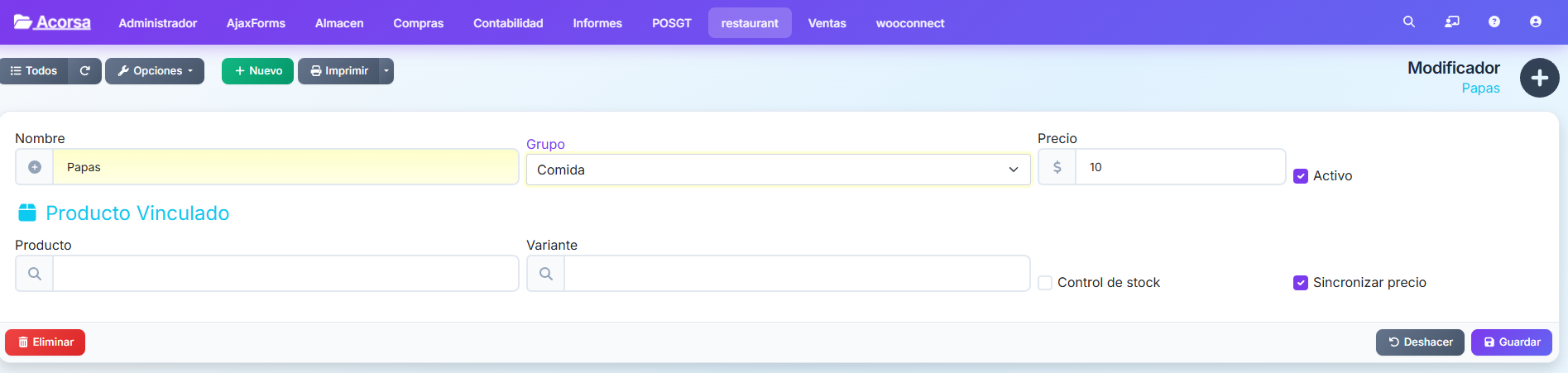 Estos modificadores son productos existentes en el almacen, para tomar en cuenta el cambio de stock de dichos productos, se asignan a un grupo para ser aplicados, ejemplo, (Plato fuerte, Postre, bebidas, etc)