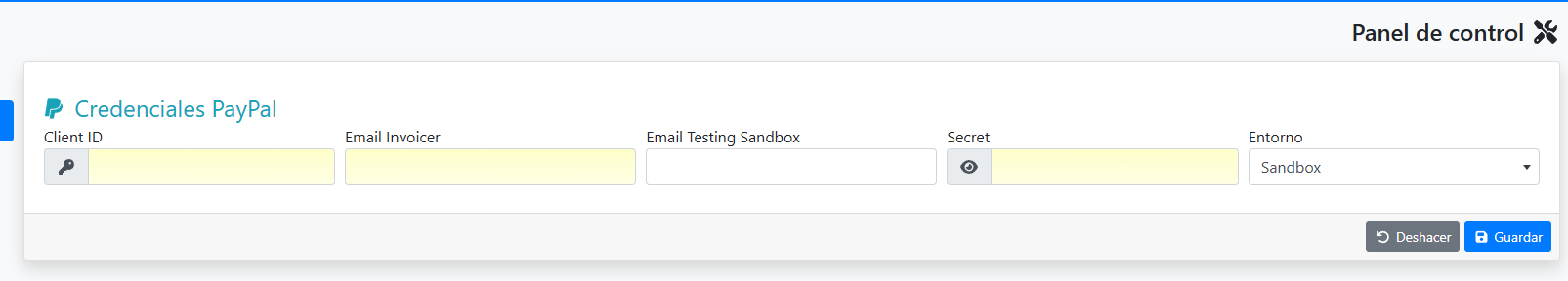 Configurar el plugin en FacturaScripts En el menú Administrador, entrá a Panel de control > PayPal y completá: