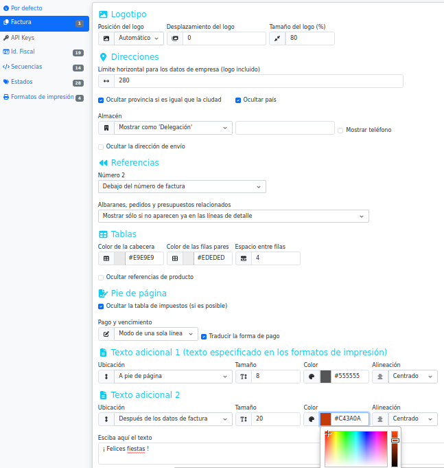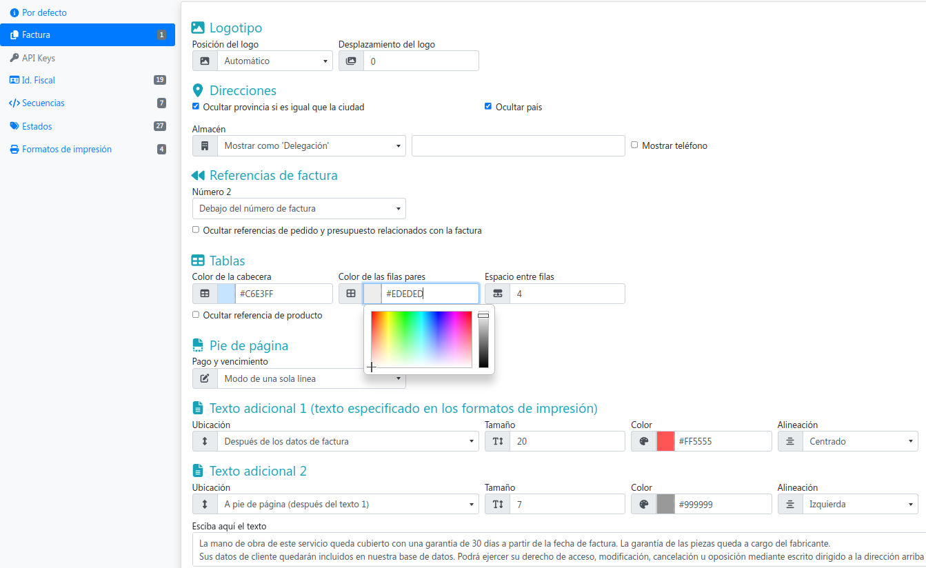 Texto adicional 2: parecido al "texto adicional 1", pero especificando el texto directamente aquí (en el espacio "Escriba aquí el texto"), sin necesidad de configurar ningún formato de impresión. Este texto aparecerá tanto en facturas, presupuestos, pedidos, etc. Ambos textos adicionales (1 y 2) pueden usarse simultáneamente en la misma factura, siendo útiles para incluir cualquier tipo de nota legal, condiciones de garantías, política de privacidad de datos, etc. (incluso para felicitar las fiestas si se desea)