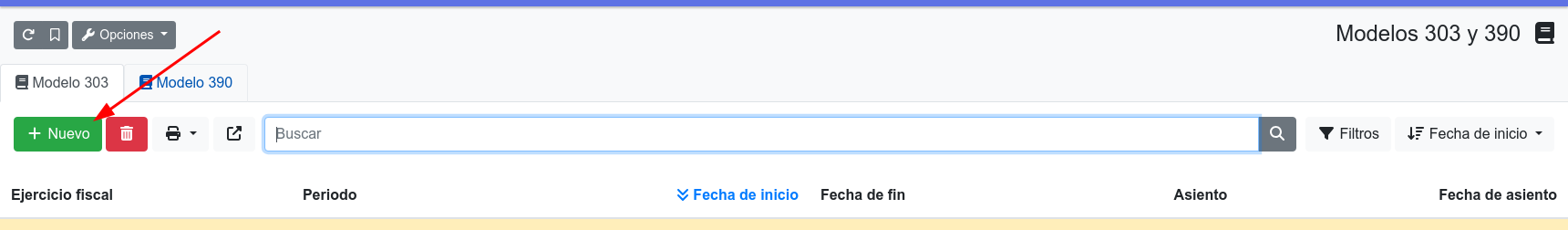 Para hacer la autoliquidación timestral de IVA haga clic en el menú Informes, Modelo 303 y 390. A continuación clic en el botón nuevo.