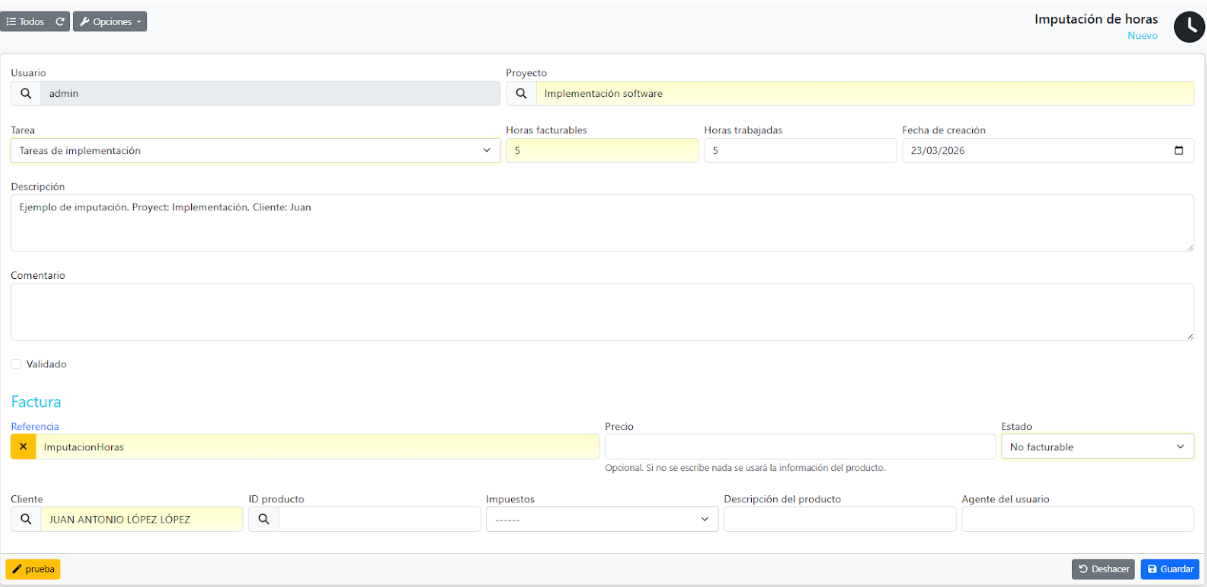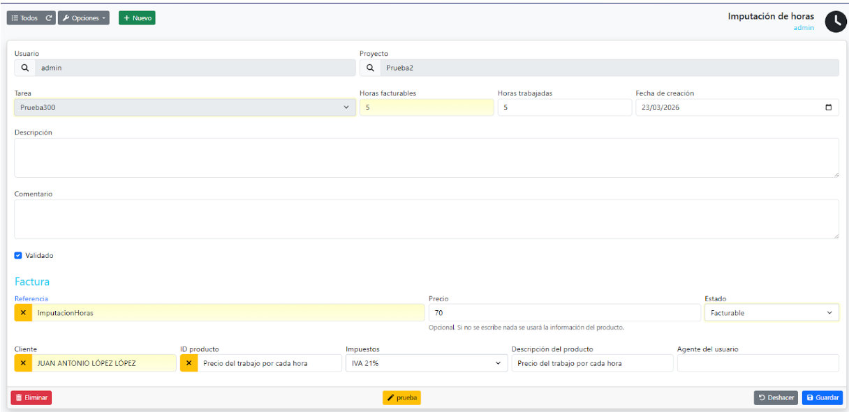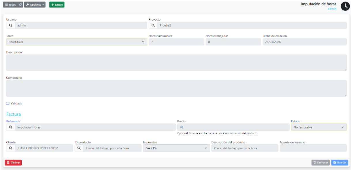 Como se puede observar en el soporte visual, se ha elegido un proyecto, se ha seleccionado una tarea del proyecto, se ha puesto unas horas facturables, por defecto se ponen las mismas horas en las trabajadas, la fecha de creación se pone la actual pudiendo cambiarla si fuera necesario, se ha elegido una referencia de un producto, se ha elegido el estado. Las opciones son: