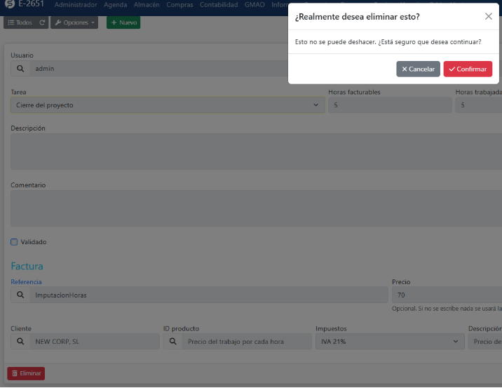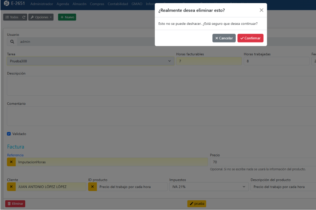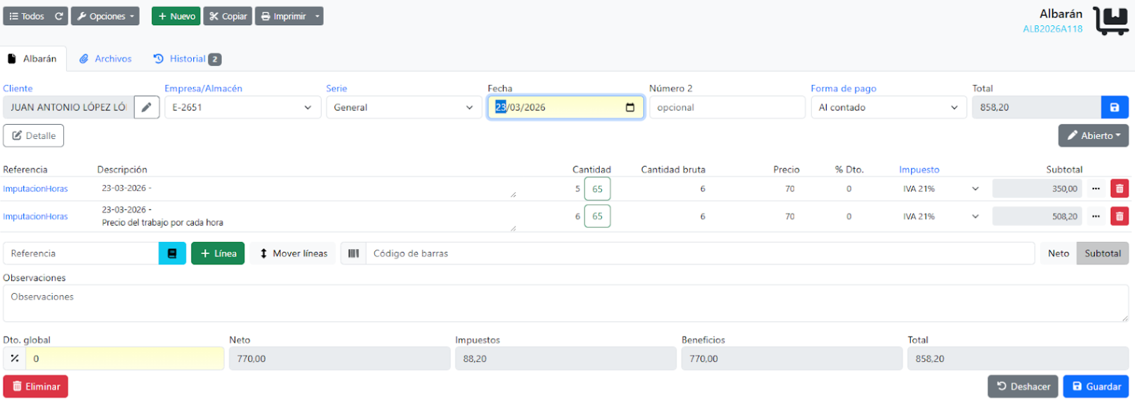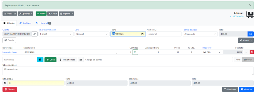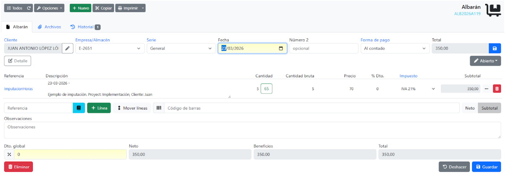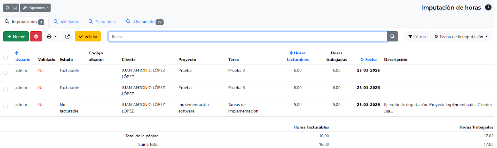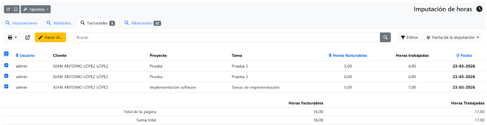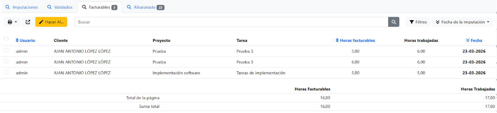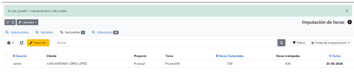 - Después crea el albarán de las imputaciones facturables. Hecho esto, la única forma de editar las horas será desde el propio albarán, hasta que este se facture.