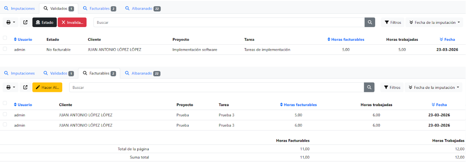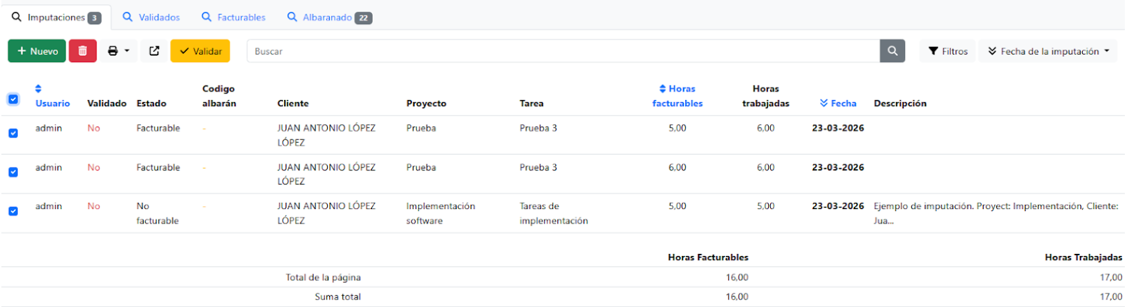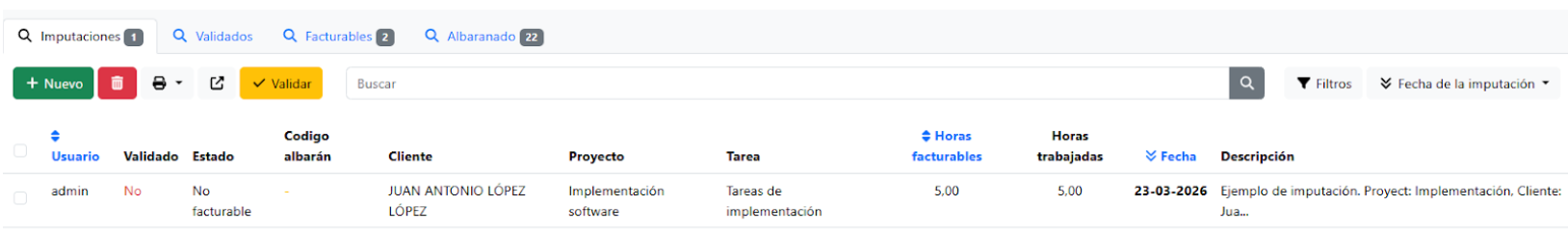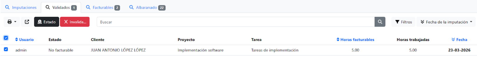 Una vez seleccionadas, hay que darle al botón amarillo de Validar. Esto moverá las imputaciones a Validados o a Facturables, dependiendo del estado que tuvieran.
