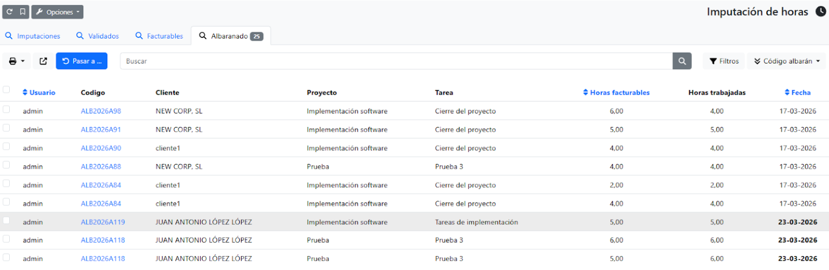 Ahora las imputaciones que se han generado albarán pasan a la categoría de albaranado. Aquí aparecerá una nueva columna llamada código donde aparece el código del albarán. Aparecerá en azul ya que si se interactúa con él te redirige a ese albarán.