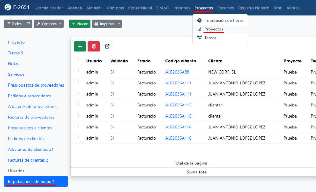 Una vez el plugin está instalado y activado, en el menú superior tendremos que entrar en la pestaña de Proyectos. Dentro se nos habrá añadido una nueva página llamada Imputación de horas.