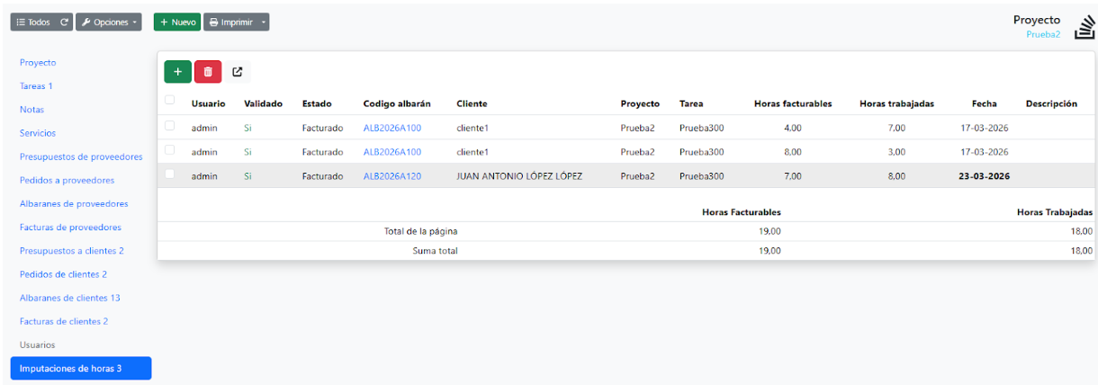 Aunque sí se podrán cambiar las horas facturables y trabajadas, para poder hacer estos cambios tendremos que entrar en el albarán de la imputación que se quiera modificar y desde allí cambiar las horas. Al darle a guardar se verá ese cambio reflejado en la imputación.