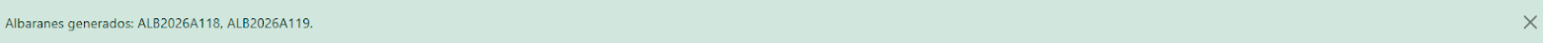 Cuando se generen los albaranes saldrá un mensaje en verde con el nombre de los albaranes creados.