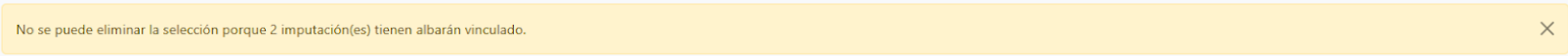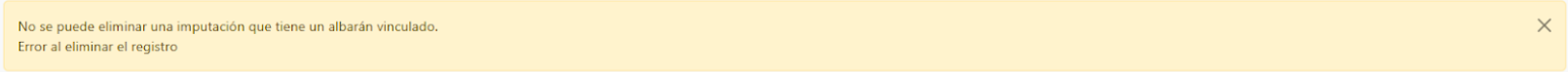 Soporte visual del mensaje de error al intentar eliminar algunas imputaciones con un albarán vinculado.