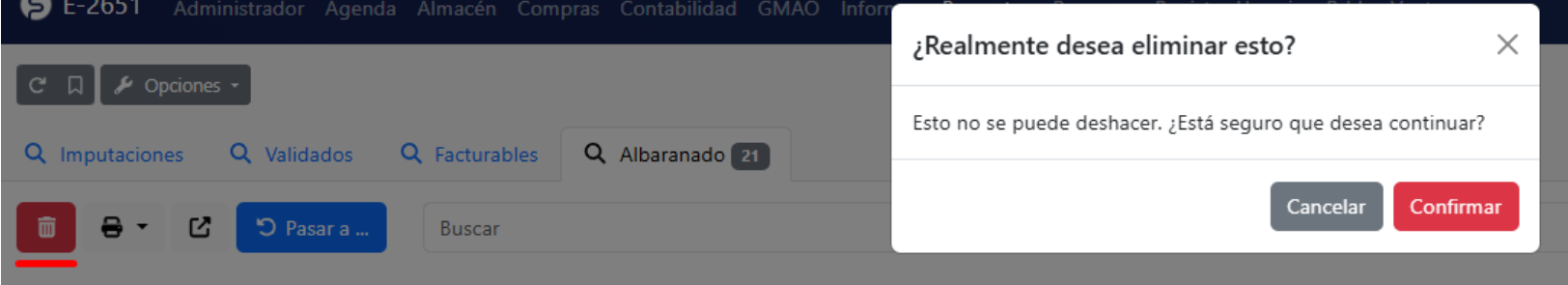 Para eliminar en la segunda fase, primero hay que eliminar el albarán vinculado a la imputación. Una vez eliminado y que ya no salga el código del albarán, hay dos formas de eliminar: