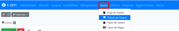 Una vez el plugin está instalado y activado en el menú superior se añadirá una pestaña “Gastos”, que es donde haremos las configuraciones pertinentes. En la pestaña Gastos hay 4 páginas que podemos modificar: Tickets de Gastos, Hoja de Gastos, Tipos de Pago y Tipos de Gastos.