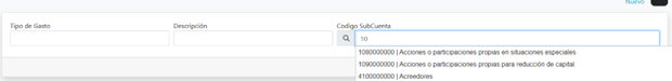 Como se puede ver en el soporte visual al crear un tipo de gastos nuevo se tiene que añadir que tipo de gasto será, la descripción de este y para finalizar hay un campo que se autocompleta que hace referencia a las subcuentas de la empresa y como se puede ver en la imagen salen todas las subcuentas que coincidan con lo escrito en el campo.