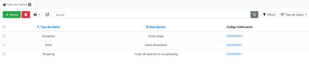 Empezamos con las páginas del plugin y la primera que modificaremos en este caso es Tipos de Gastos (no es estrictamente necesario seguir el orden de la guía pero si es lo recomendable). Esta página dispone de 3 campos que son: Tipo de Gasto, Descripción y Código SubCuenta.