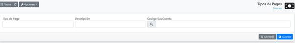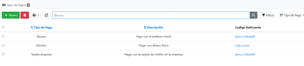 Ahora que ya tenemos los tipos de gastos hechos vamos con los tipos de pagos, la configuración de estos es prácticamente idéntica que con los tipos de gastos ya que también tienen solo 3 campos y son los mismos que para los tipos de gastos. La diferencia es con la información que se le pondrá.