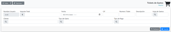 Empezamos con la parte más extensa del plugin que son los tickets de gastos. Estos se conforman de varios campos para que estén lo más detallados posibles. El campo de nombre de usuario se rellena automáticamente con el nombre del usuario que está creando el propio ticket de gasto
